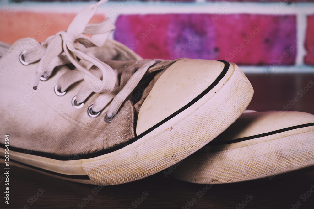 Old canvas shoes on a wooden floor Vintage Retro Filter.