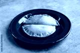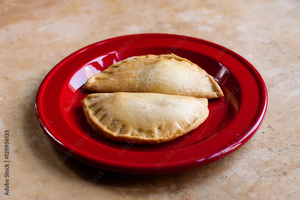 Two stuffed pie tarts on a red plate. selective focus, shallow depth