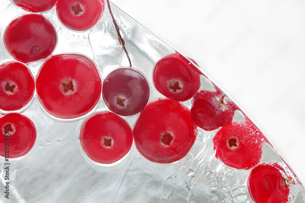 Frozen red berries. Forest cranberry in piece ice. macro view. copy space