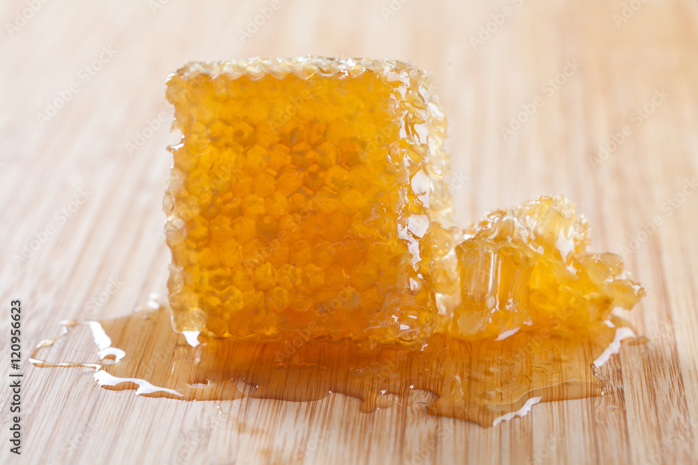 Organic honeycomb on the wooden board and pastel background. Tasty yellow, gold honey combs texture with fresh honey.