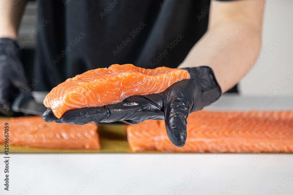 close-up of fresh salmon fillet held in black gloves, ready for slicing and cooking preparation, showcasing vibrant orange color and detailed texture