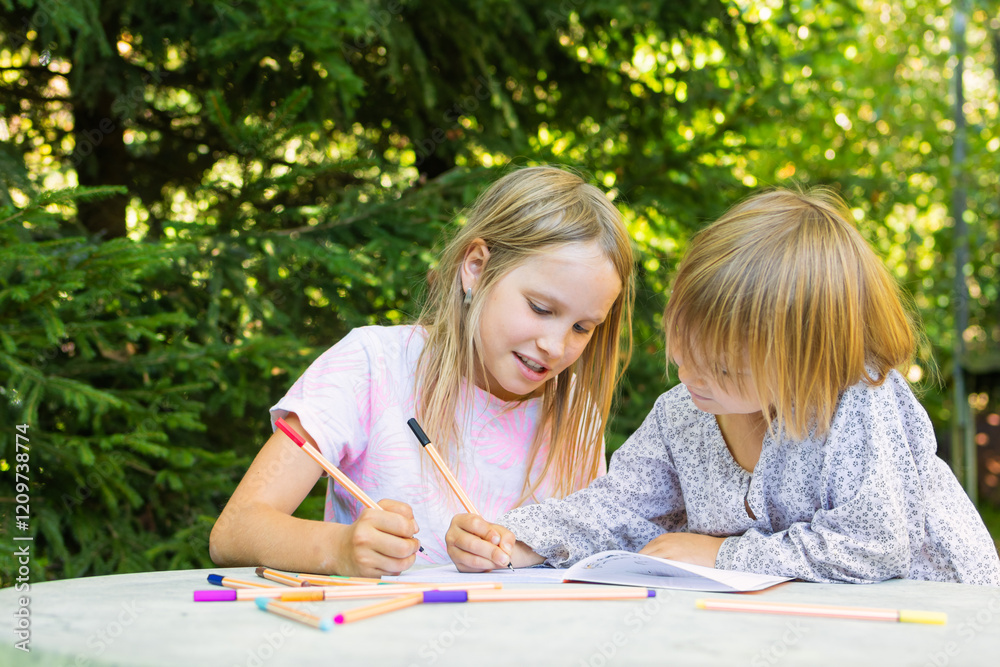 Siblings sharing a bonding moment while drawing in a sunlit garden