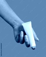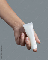 Female hand holding white cream tube against grey close up, cosmetic mockup, copy space