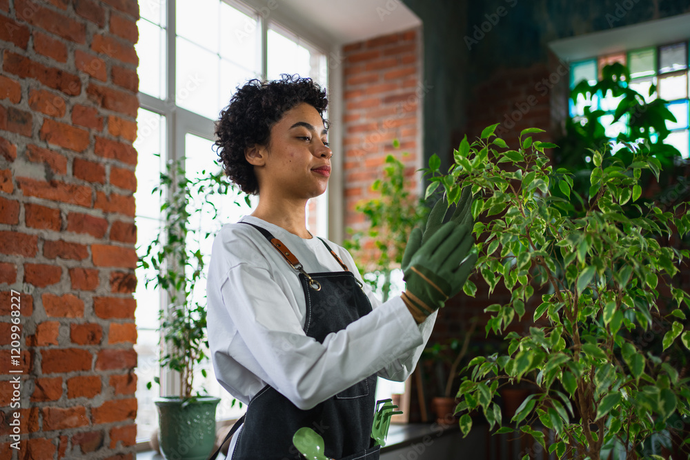 Running of own business. African woman florist wearing apron taking care of plants in botanical store. Happy small business owner working at flower shop smiling surrounded by plants Small business