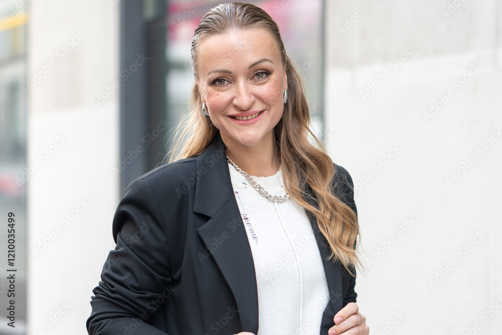 A 35-40 year old business woman with long blonde hair wearing a stylish jacket, smiling on the street.