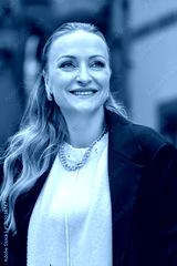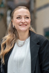 Confident woman 35-40 years old in office style, smiling against the background of the building.