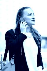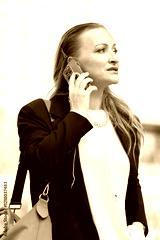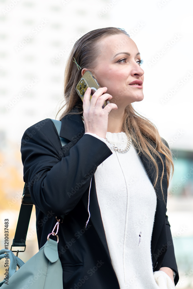 An elegant woman in a jacket holds a smartphone near her ear against a cityscape background.