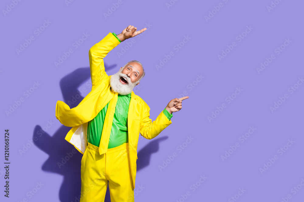 Portrait of funny extravagant aged man point fingers empty space ad yellow suit isolated on purple color background