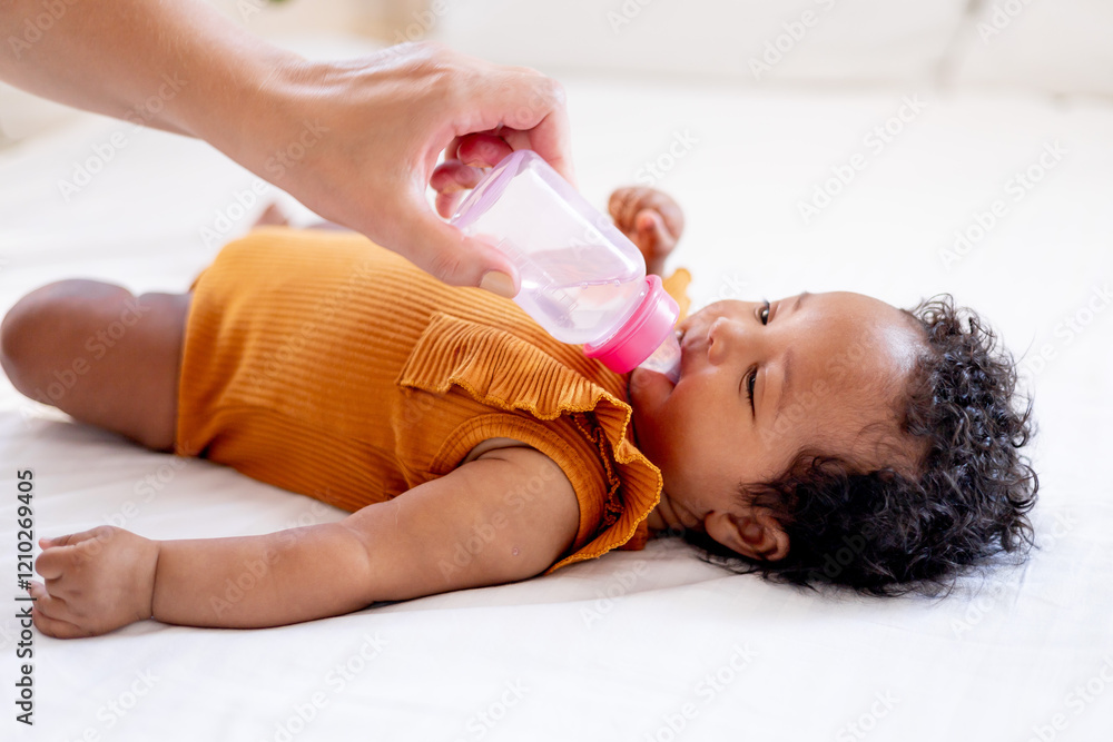 a small African-American baby girl drinks water or milk from a bottle in an orange bodysuit on a white bed, her mother's hand feeds a six-month-old black newborn baby from a bottle