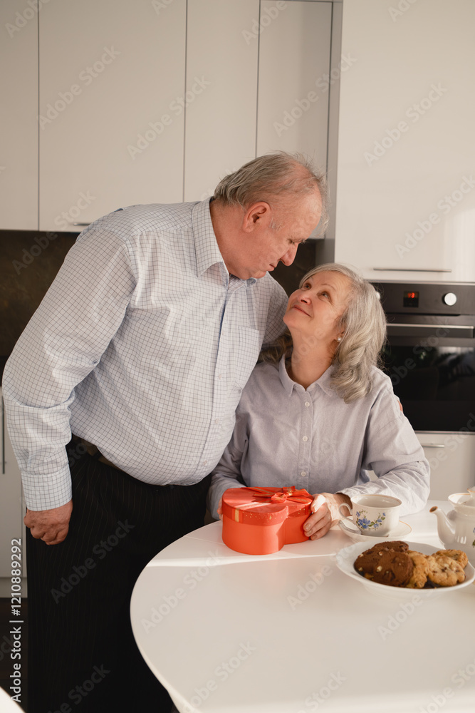 An older man and woman share a tender moment in their kitchen while exchanging a beautifully wrapped gift. The setting adds warmth, reflecting love, affection, and companionship.