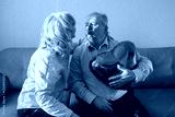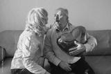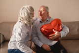 A senior couple sits together on a couch, affectionately posing with a red heart-shaped balloon. The image conveys love, connection, and lighthearted joy in a warm and comfortable environment.