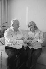 A senior man and woman seated together on a couch, sharing a heartfelt exchange of a small red box, suggesting gift-giving or a shared sentimental moment.