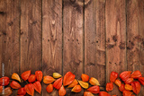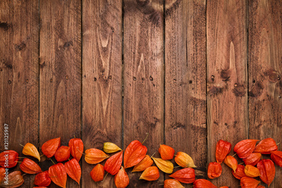 Orange Lampionblumen (Physalis) auf rustikalen Holztisch