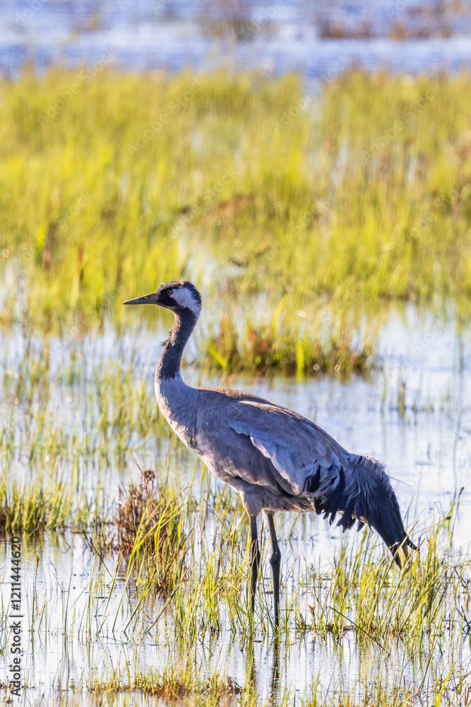 Crane on a flooded wet meadow in springtime