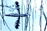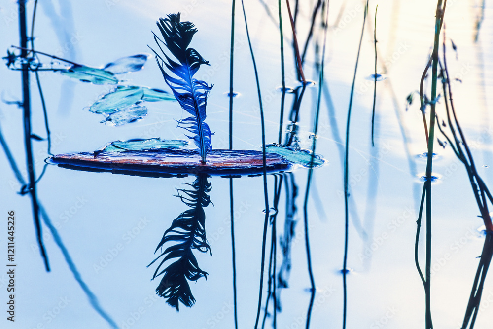Floating boat made of bark with a feather as sail