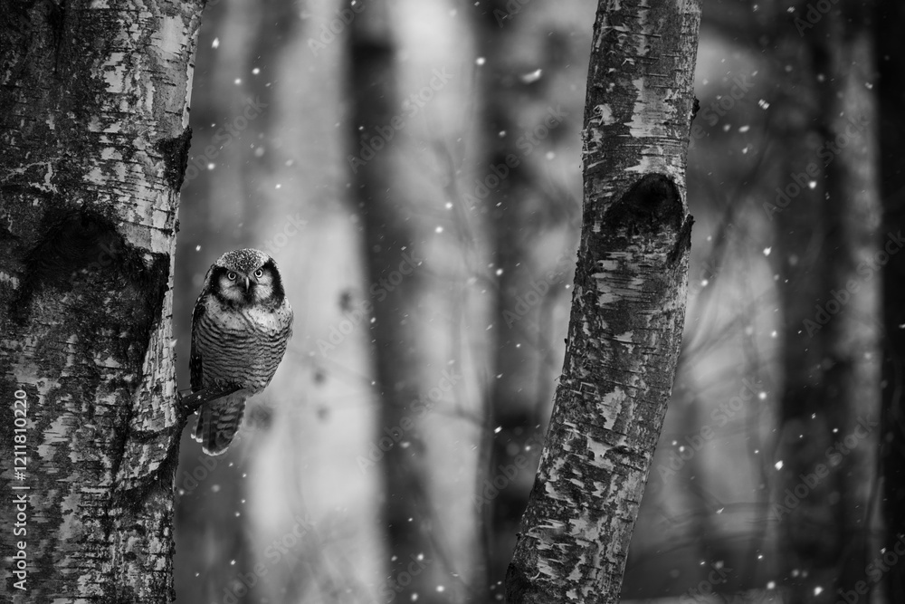 Northern hawk-owl in nature with snow