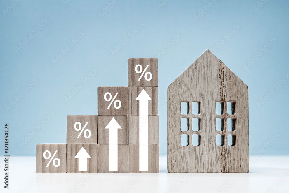 Wooden model house investment with ingreasing blocks percentage on blue background