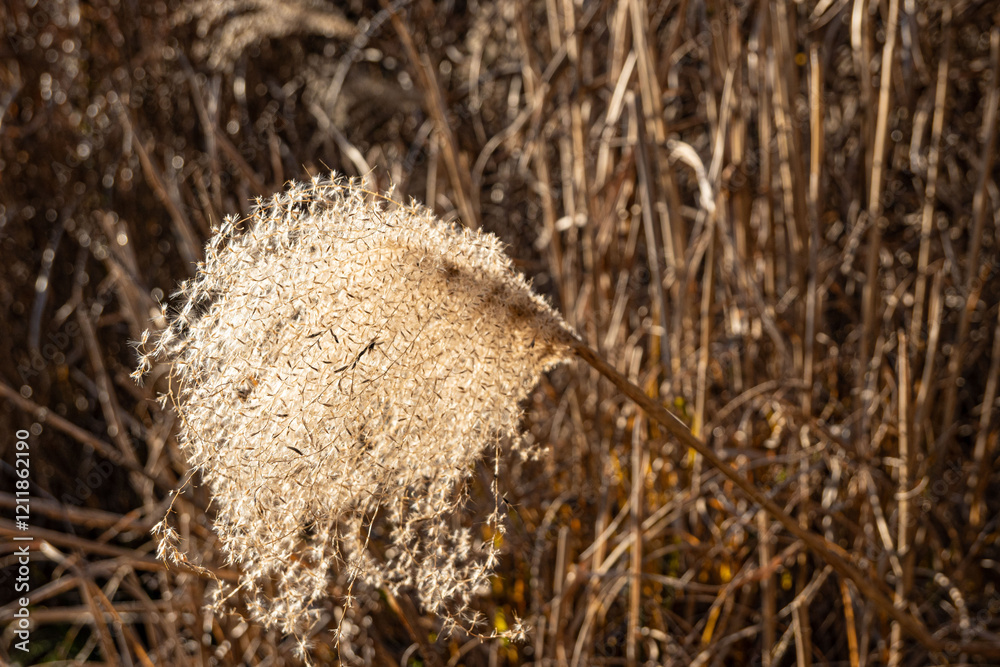 Plants, a white plume of a reed flower is haning in the sun outdoor in nature with brown golden tones at daytime on the Japanese countryside in Japan.