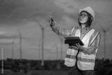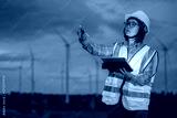 A woman technician wearing a yellow vest and a hard hat points to a tablet