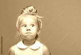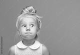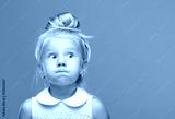 Small, young, funny girl, inflated cheeks on blue background