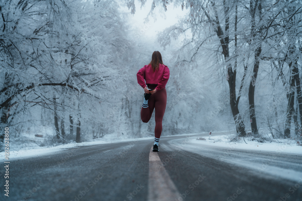 Young sportswoman stretching her legs in winter sportswear, preparing for a run along a snowy road, surrounded by tall trees and a serene, frozen landscape