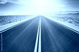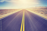 Vintage toned asphalt desert road against sun at sunset, travel concept, USA.