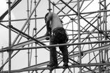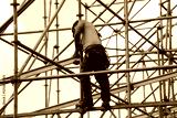 Construction worker in safety clothing setting up scaffolding for a stage or construction site
