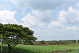 Scenic landscape with lush green fields, colorful plants, and a clear blue sky