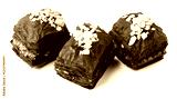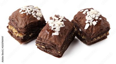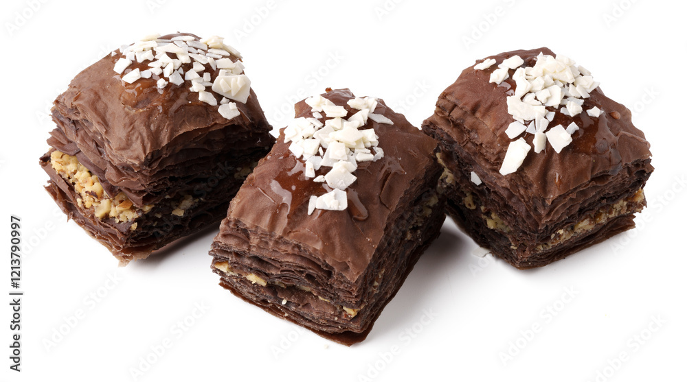 Chocolate dessert layered with flaky pastry and topped with coconut flakes, perfect for indulgence at any time of day