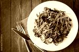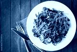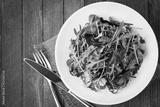 Fresh salad with mixed greens (arugula, mesclun, mache) on dark wooden background top view. Healthy food.