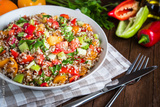 Fresh healthy salad with quinoa, colorful tomatoes, sweet pepper, cucumber and parsley on wooden background close up. Food and health. Superfood.