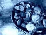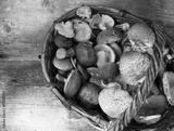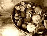 Variety of uncooked wild forest mushrooms in a basket on a wooden old board. Top view.