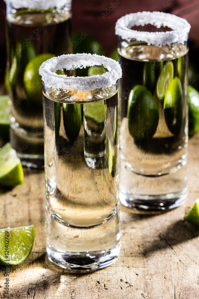 Tequila shot with lime and salt, selective focus