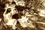 Playful family time as mother and daughters laugh with their dog in nature