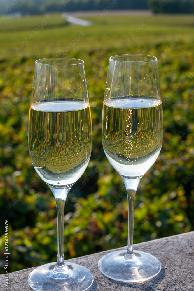 Tasting of Champagne sparkling wine with little bubbles on green vineyards near Ludes, Louvois, Val de Livre, Champagne, France