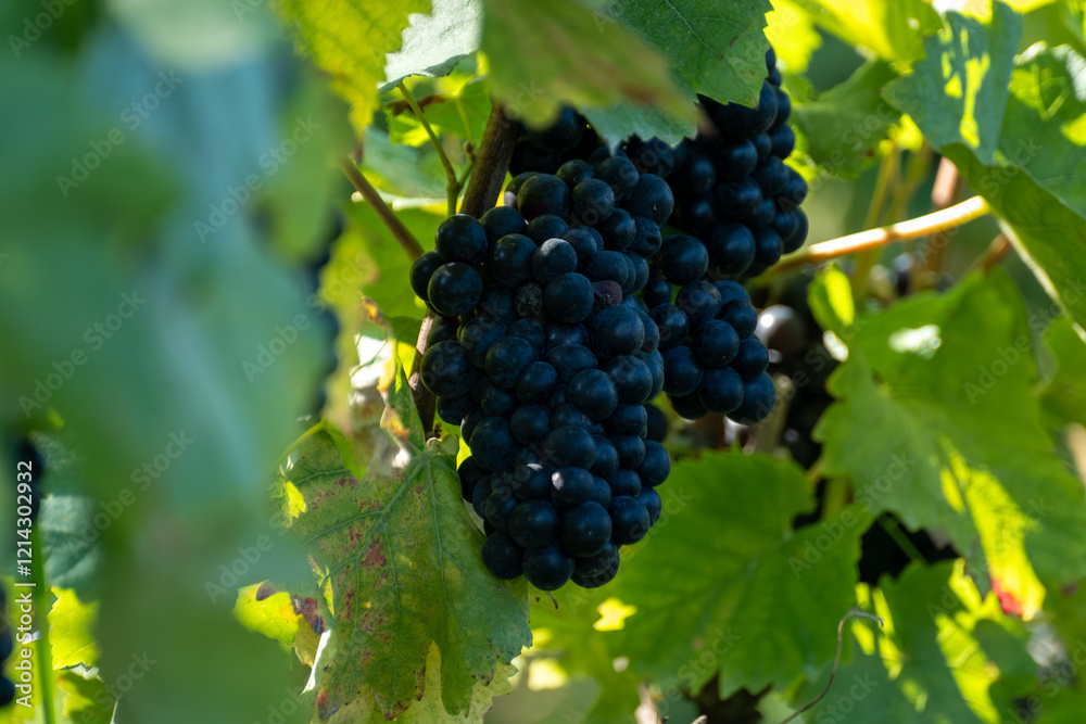 Ripe clusters of pinot meunier or pinot noir grapes at autuimn on champagne vineyards during harvest in September near villages Ludes in Val de Livre, Champange, France
