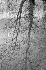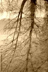 An abstract reflection of leafless trees in water, creating a mirror effect with intertwined branches