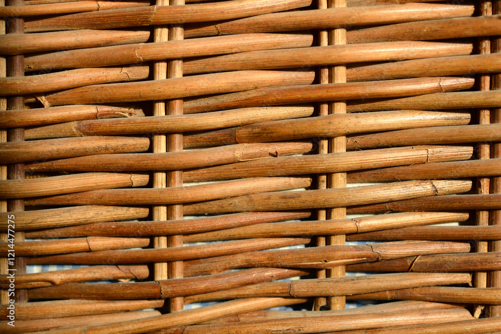 A detail of a woven basket with an emphasis on the texture and intertwined elements