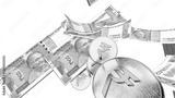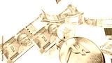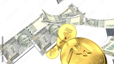 Golden Indian rupee sign and Indian currency coin isolated on 3d render. bearish and bullish golden arrow stock market background.