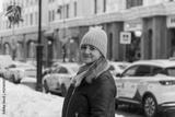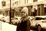 A young woman in a warm outfit stands on a snowy street, smiling at the camera. Yellow taxis are parked nearby, creating a lively urban atmosphere in winter.