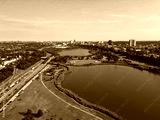 aerial view of new york city skyline from corona flushing meadows park with dramatic dark sky coming clouds at sunset (lake distant skyscrapers of manhattan far away) horizon silhouette shadow queens