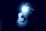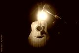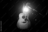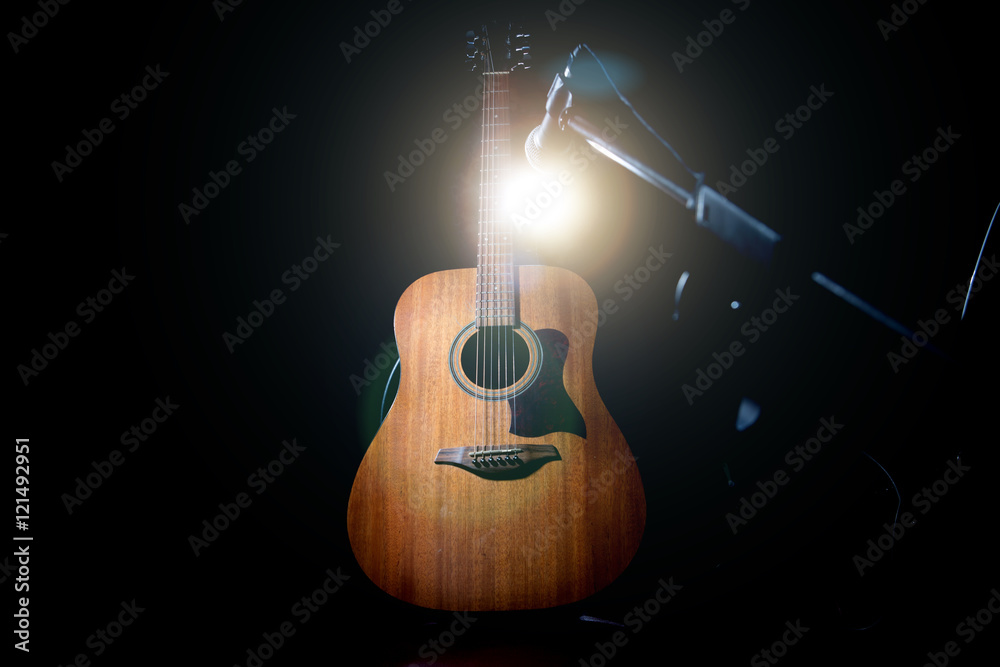 Acoustic wooden a guitar over black background. Music and concert concept.