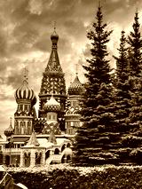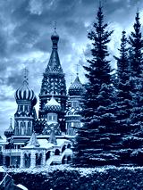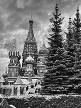 St. Basil's Cathedral shines amidst snow-laden trees under a vibrant winter sky in Moscow's enchanting landscape