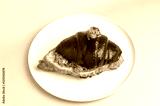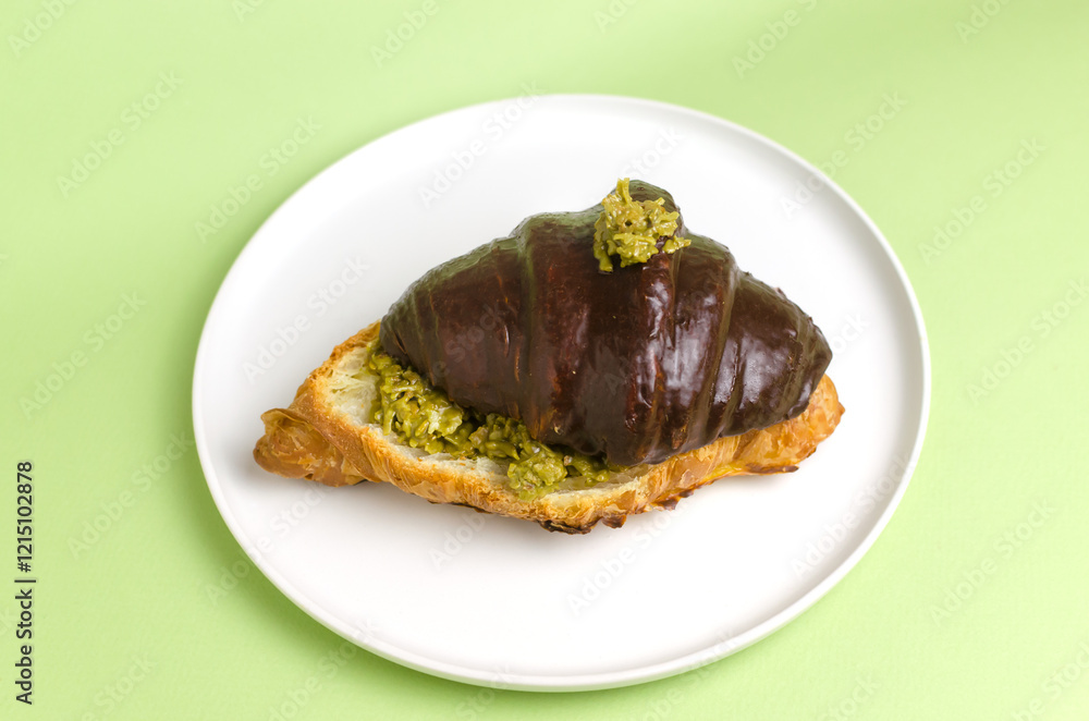 Croissant stuffed with pistachio paste and kadaif dough covered with dark chocolate on a gray plate on a green background. Unusual pastry with a delicate filling. Trend food concept. Selective focus.