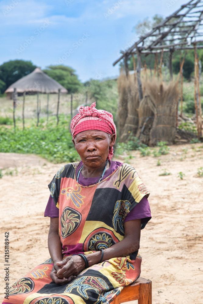 village old single african woman walking between the tribal mud straw huts with thatched roofs in the village, wearing traditional clothing
