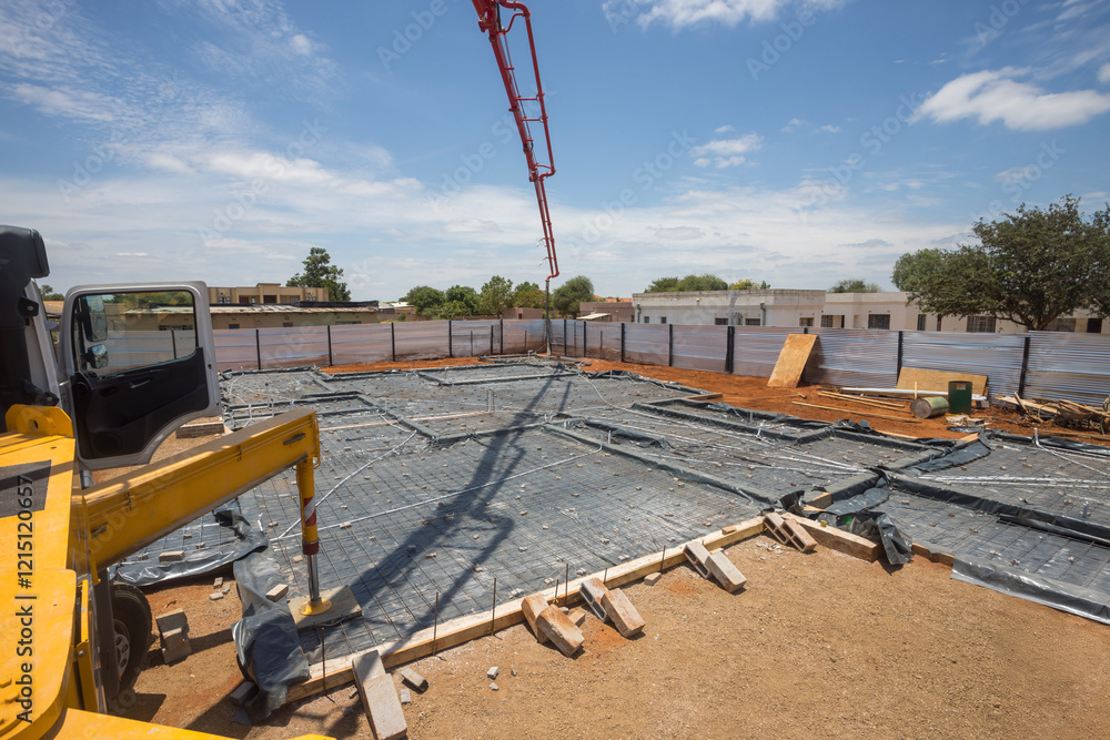 concrete boom pump arm pouring concrete foundation at construction site, reinforced foundation with steel rebar, cover concrete with plastic foil