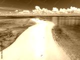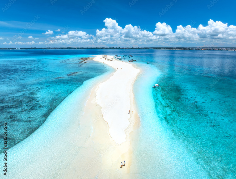 Aerial view of Nakupenda island, sandbank in ocean, white sandy beach, blue sea during low tide on sunny summer day. Zanzibar. Top view of sand spit, clear water, people, sky with clouds. Tropical