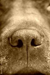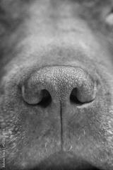 Dog face with nose close-up in defocus