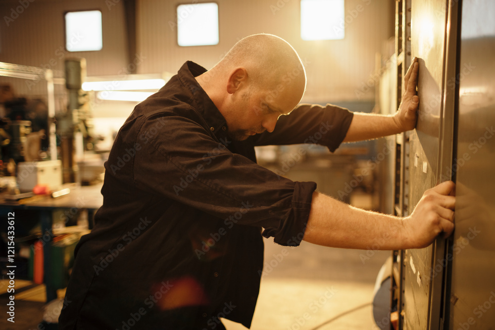 Stressed factory worker leaning against equipment in workshop