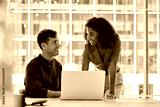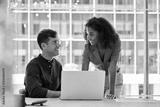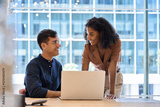 Busy happy business people work team colleagues using laptop computer working together in office. Two diverse employees professionals discussing financial data at corporate business meeting.